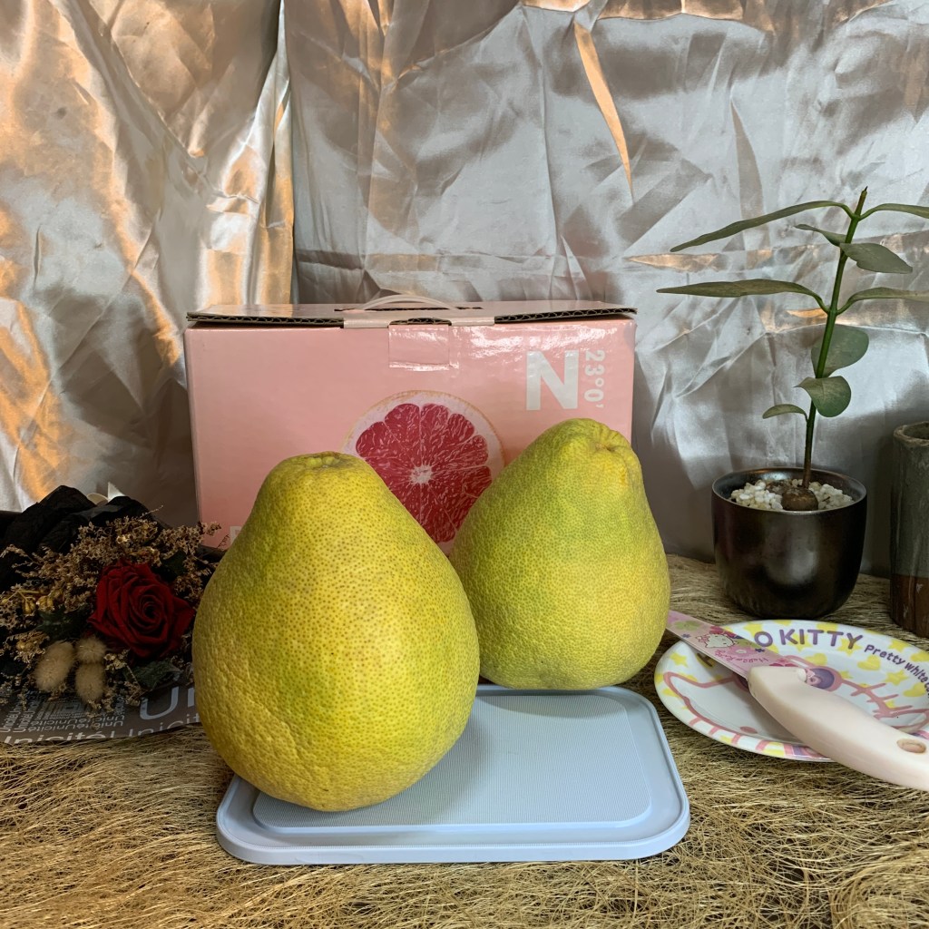 麻豆老欉紅文旦怎麼挑?這兩顆紅文旦大小比嬰兒頭還大顆,很有份量,這也是判別老欉文旦紅柚的標準,跟麻豆白文旦不同的是,麻豆老欉紅文旦是越大顆越好!一般來說在2台斤左右是好紅柚的基本盤,重量夠才表示水分足夠會爆汁!!