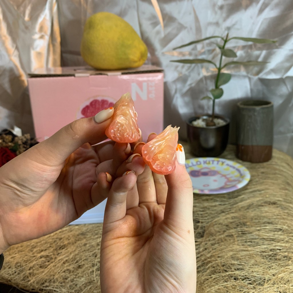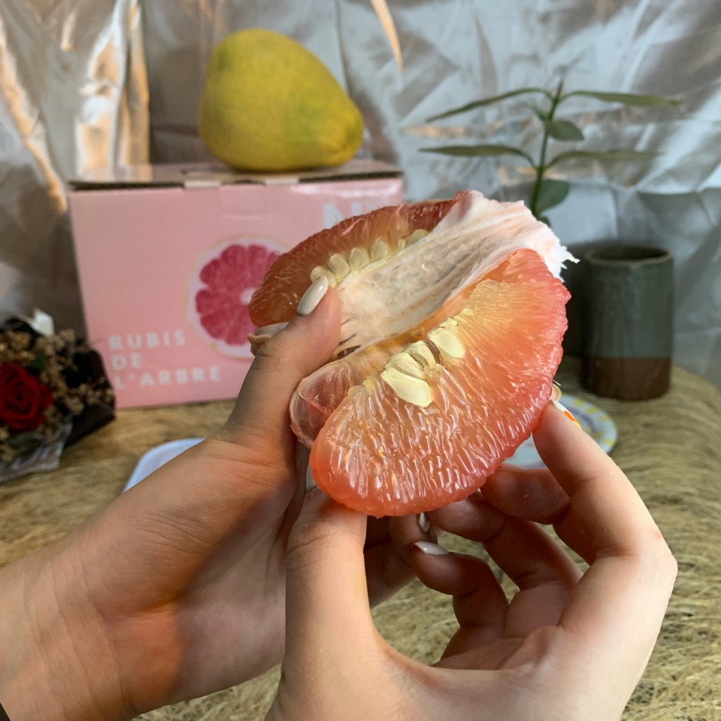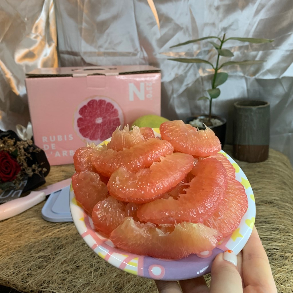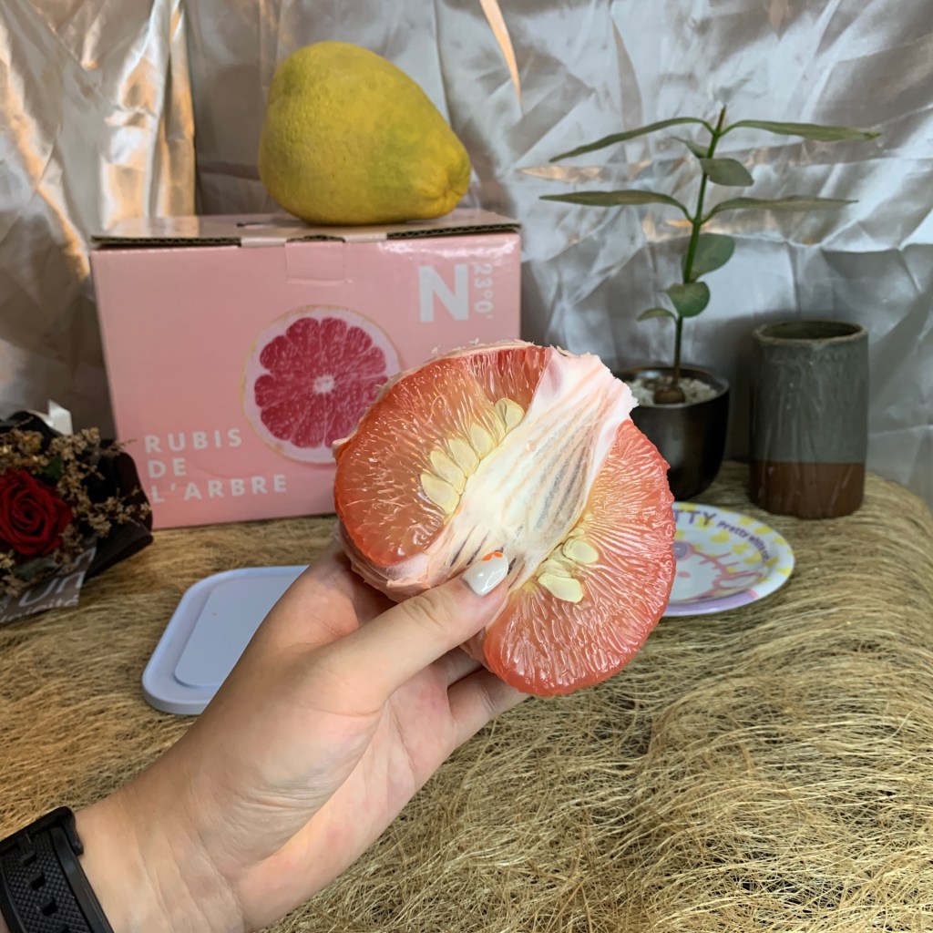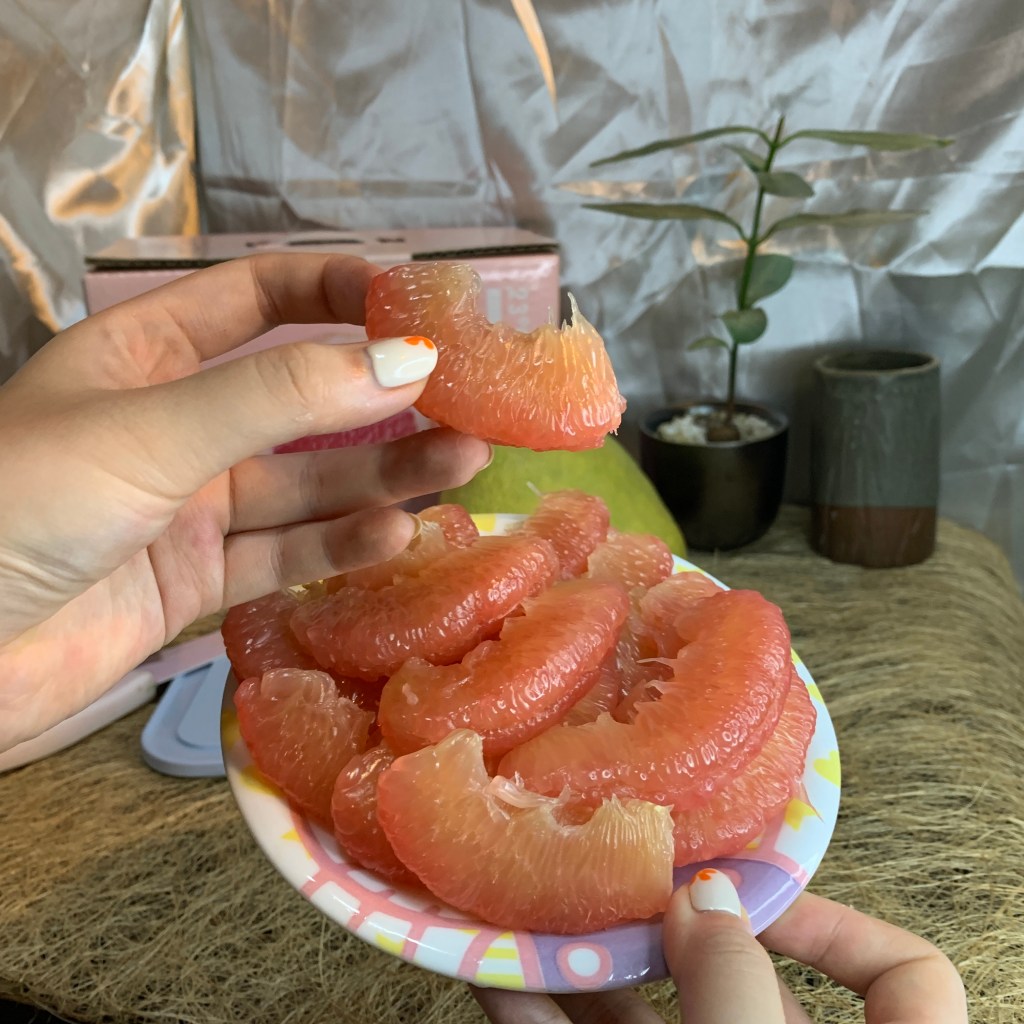 紅文旦口感比白文旦軟嫩許多!硬要說的話白文旦比較偏韌性、脆感;紅文旦就是嫩且多汁,如果白文旦的多汁程度是8分,那紅文旦就是12分!味道是甜中帶微微微微的酸,尾韻還有一點點的苦,不過因為紅文旦的甜度,這個酸感跟微苦反而增加風味的層次,就像是高級巧克力尾韻有苦味一樣,更讓人回味無窮,庄稼郎紅文旦的味道讓我想到葡萄柚的風味,不過比葡萄柚更好吃!🤣