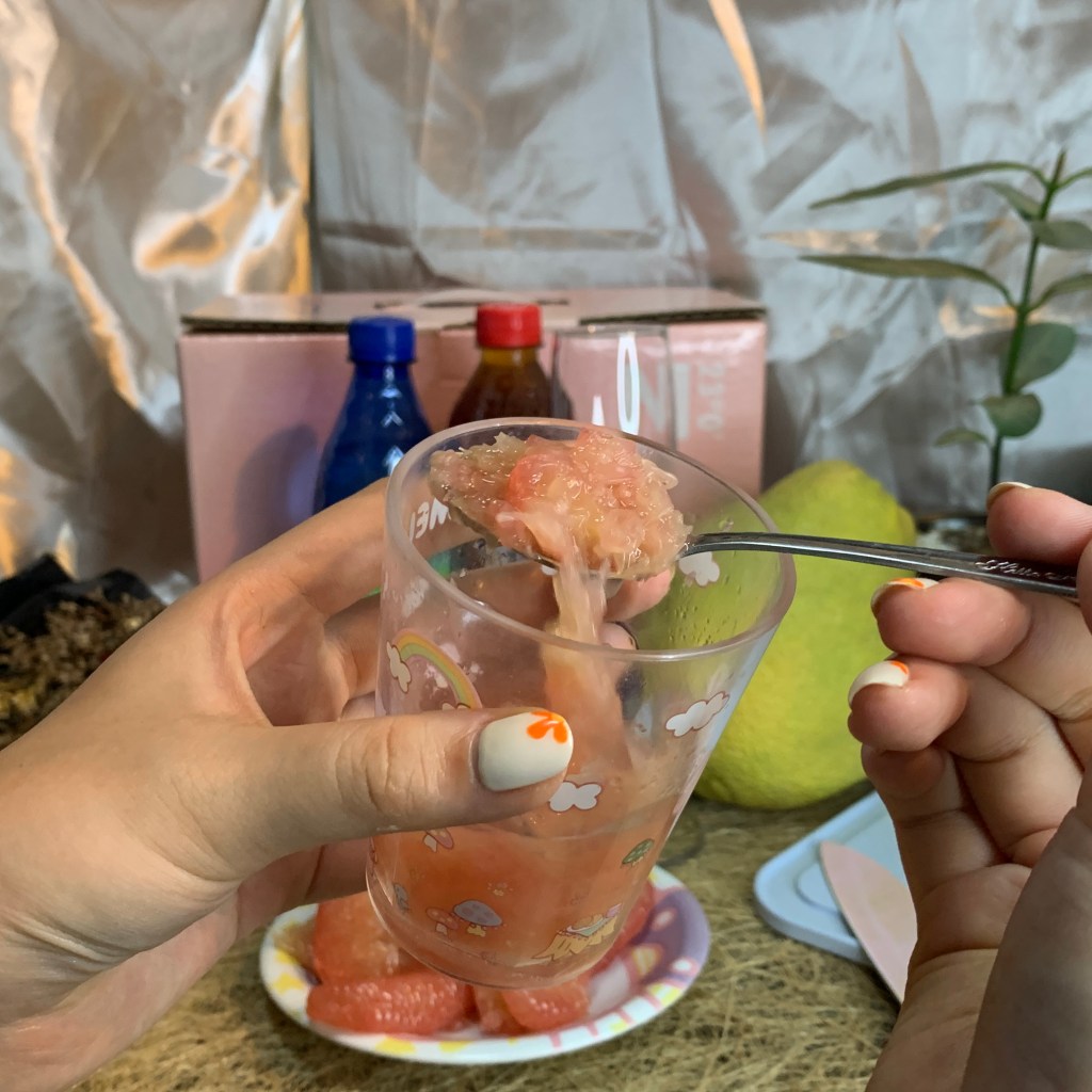 因為想保留果肉口感,怕果肉變成果渣渣,這次我決定不要用果汁機,依序把紅柚放進杯子中,用湯匙擠壓出紅柚汁液,同時可以保留些許果肉口感,另外在杯中加了大約兩匙檸檬汁
