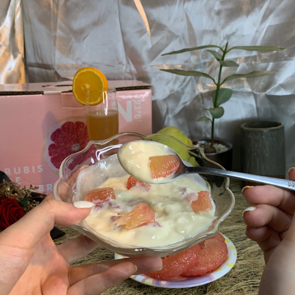 挑選原味優格,加入一點老欉文旦紅柚果汁攪勻,再切入小塊麻豆文旦紅柚