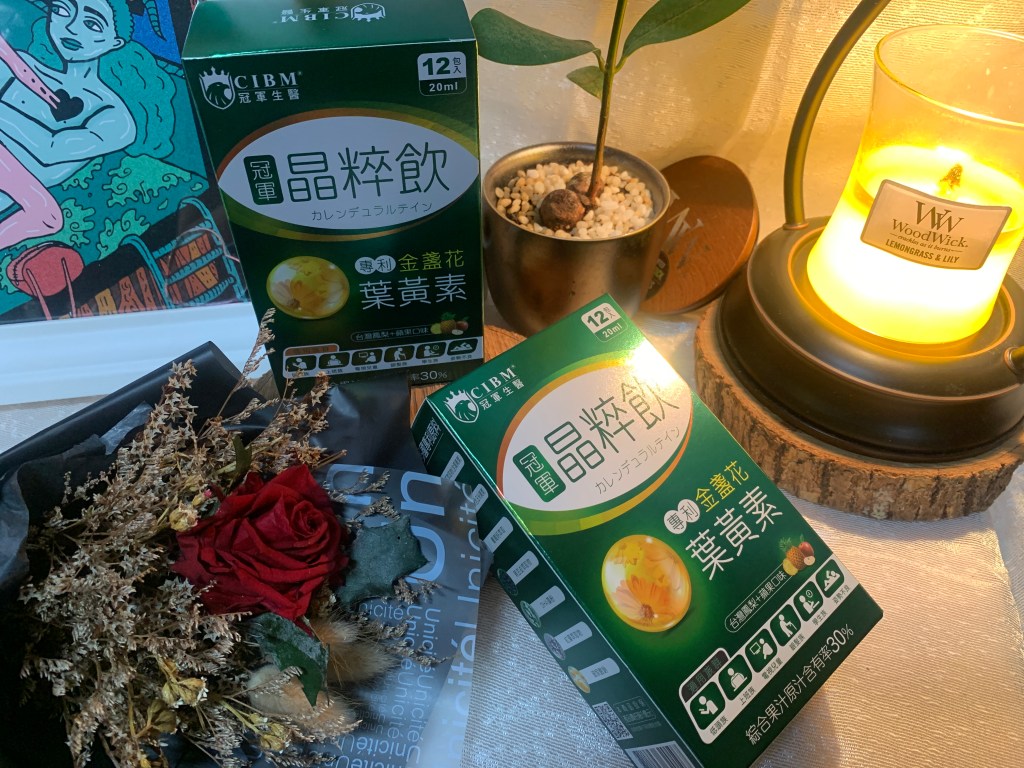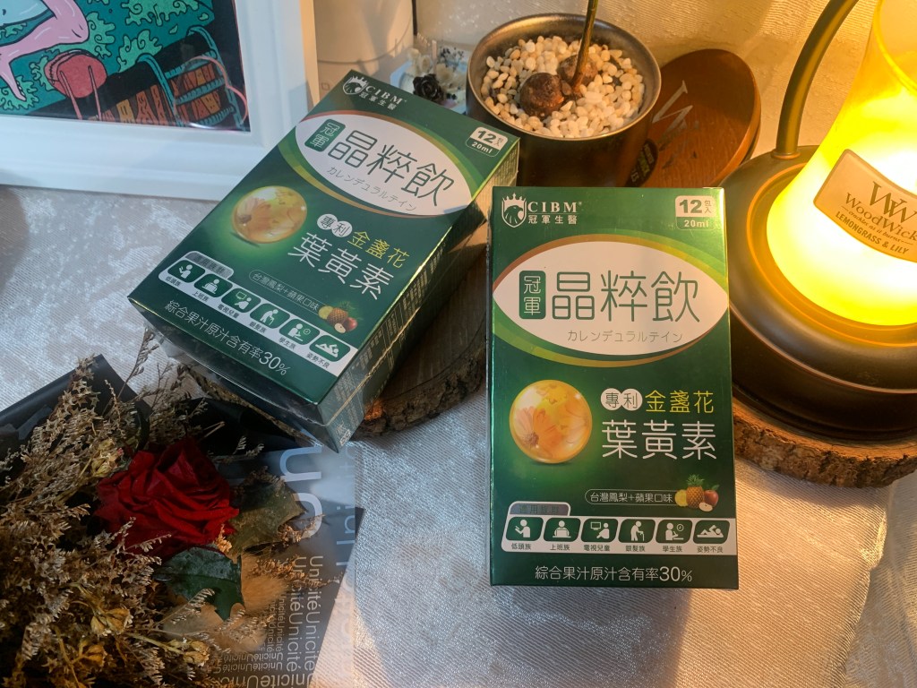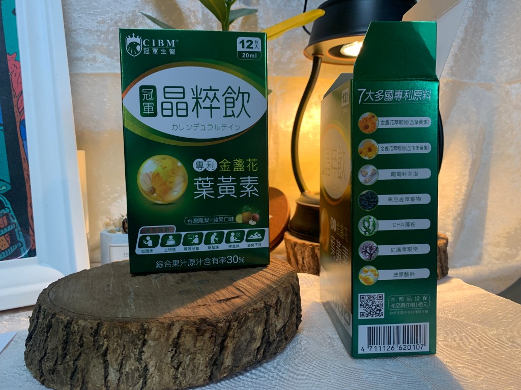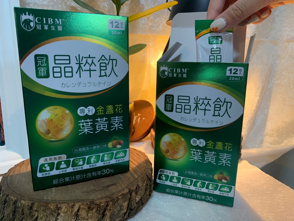 冠軍晶粹飲葉黃素、玉米黃素來源於美國專利金盞花,全產品都是植物萃取成分,不含任何動物性成分,所以口感我覺得很舒服,就是果汁口感