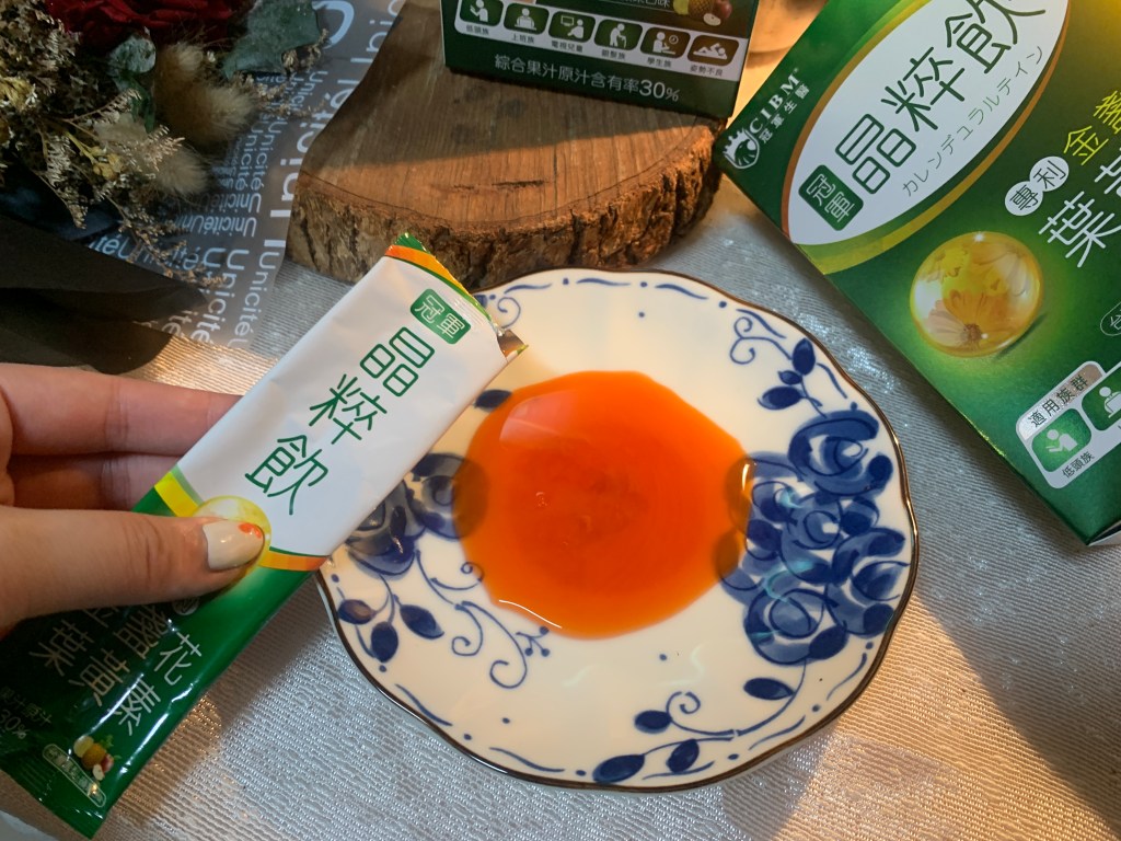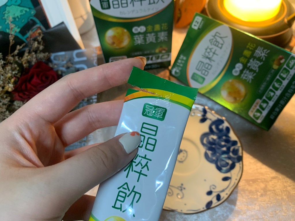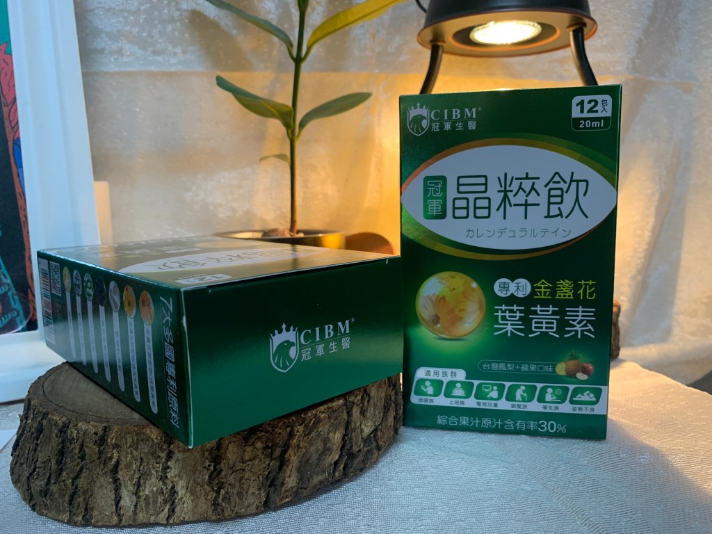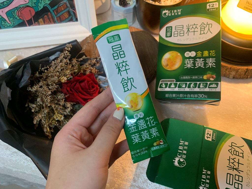 冠軍晶粹飲葉黃素、玉米黃素來源於美國專利金盞花,全產品都是植物萃取成分,不含任何動物性成分,所以口感我覺得很舒服,就是果汁口感