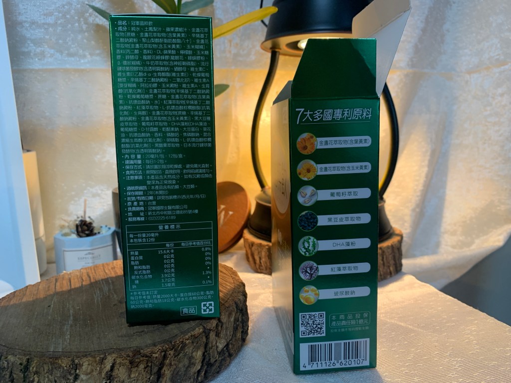冠軍生醫使用7大專利原料:專利品種金盞花萃取(葉黃素、玉米黃素)、葡萄籽萃取、黑豆皮萃取物、DHA藻粉、紅藻萃取物、玻尿酸鈉,使用美國衛生研究院建議配方,並提供全方位完整成分