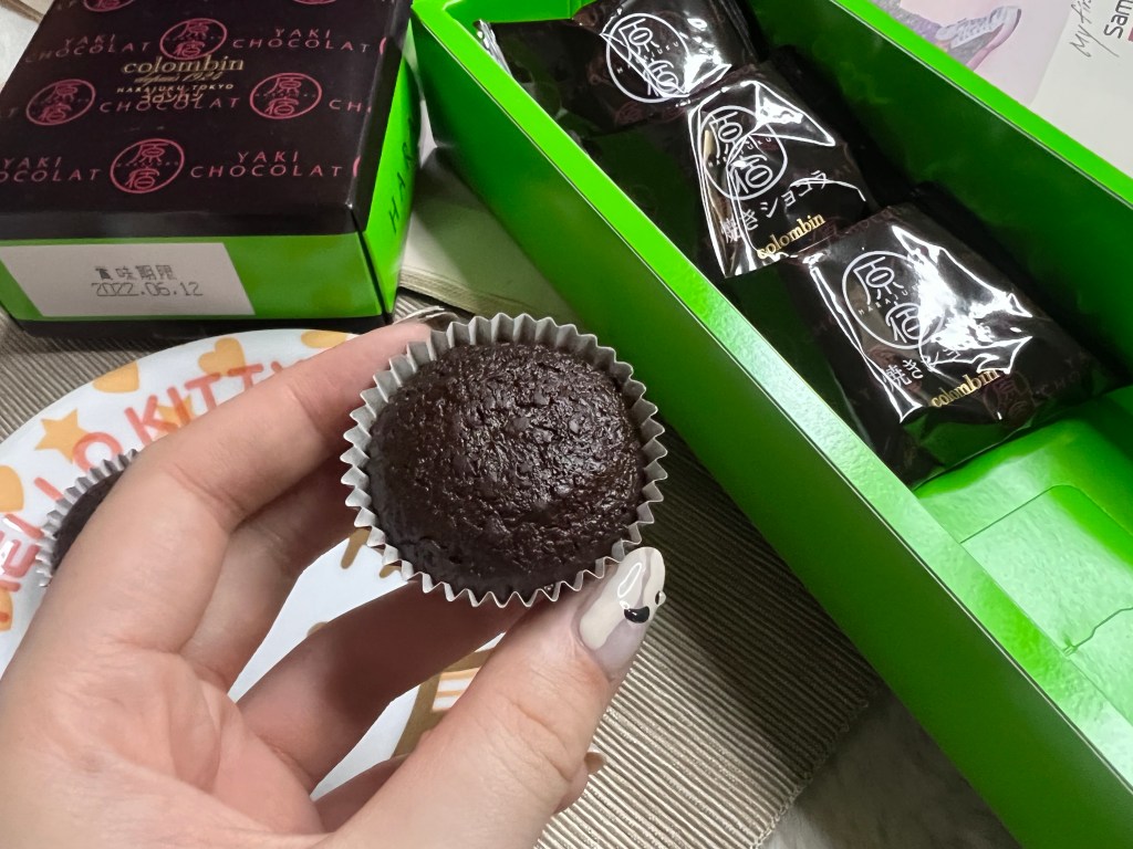 colombin是唯一一間成為宮內廳御用的老字號甜點製造商,1924年就創立,更是最早將傳統法式甜點工法引進日本的製造商。小小一顆原宿燒,使用優質巧克力跟新鮮小麥粉製成,外表要看起來是濕軟質地,但其實外側是酥脆的蛋糕體,給你們看看橫切面